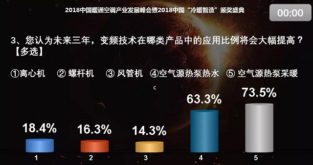 未來三年,空氣源熱泵行業增長點主要來自于哪些產品?這一問題給出了空氣源熱泵戶式水機、熱風機、空氣源熱泵商用采暖和空氣源熱泵工農業應用四個選項。與會人士選擇最多的便是空氣源熱泵商用采暖。